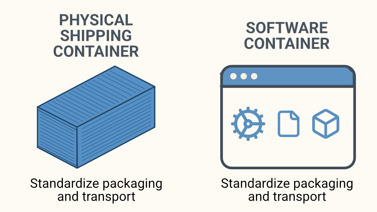 Think of a container as a standardized shipping container for software. Just as a physical shipping container carries goods from factories to ports to trucks without needing to unload and reload, a software container wraps up an application and all its dependencies so it can run consistently anywhere.